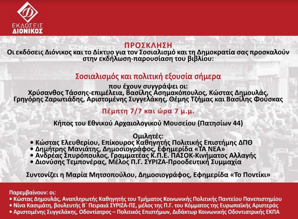 Οι Εκδόσεις Διόνικος και το Δίκτυο για το Σοσιαλισμό και τη Δημοκρατία σας καλούν στην εκδήλωση-παρουσίαση του συλλογικού βιβλίου: «ΣΟΣΙΑΛΙΣΜΟΣ ΚΑΙ ΠΟΛΙΤΙΚΗ ΕΞΟΥΣΙΑ ΣΗΜΕΡΑ», που έχουν συγγράψει οι Χρύσανθος Τάσσης – επιμέλεια -, Βασίλης Ασημακόπουλος, Κώστας Δημουλάς, Γρηγόρης Ζαρωτιάδης, Αριστομένης Συγγελάκης, Θέμης Τζήμας και Βασίλης Φούσκας. Ομιλητές: Κώστας Ελευθερίου, Επίκουρος Καθηγητής ΔΠΘ Δημήτρης Μανιάτης, Δημοσιογράφος […]