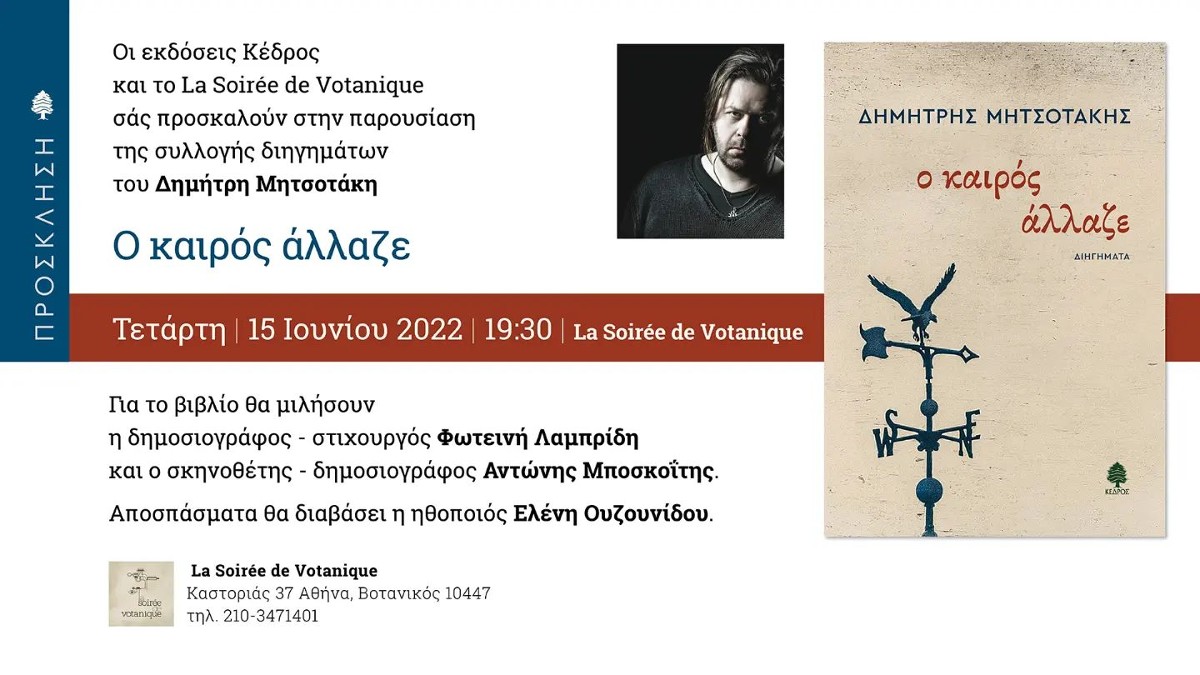 Παρουσίαση της συλλογής διηγημάτων του Δημήτρη Μητσοτάκη «Ο καιρός άλλαζε» (εκδόσεις Κέδρος) θα πραγματοποιηθεί την Τετάρτη 15 Ιουνίου, στις 19:30 το απόγευμα, στο La Soiree de Votanique. Για το βιβλίο θα μιλήσουν η δημοσιογράφος – στιχουργός Φωτεινή Λαμπρίδη και ο σκηνοθέτης – δημοσιογράφος Αντώνης Μποσκοΐτης, ενώ αποσπάσματα θα διαβάσει η ηθοποιός Ελένη Ουζουνίδου.