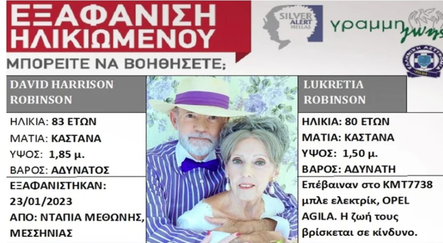 Η υπηρεσία Silver Alert ενεργοποιήθηκε μετά την εξαφάνιση του 83χρονου Ντέιβιντ Χάρισον Ρόμπινσον και της 80χρονης συζύγου του, Λουκρητίας Ρόμπινσον, από τις ΗΠΑ, με την κόρη τους να δηλώνει βέβαιη πως οι γονείς της αυτοκτόνησαν. Το ζευγάρι έφυγαν από το σπίτι τους στην περιοχή Ντάπια Μεθώνης και έκτοτε τα ίχνη τους έχουν εξαφανιστεί. Πληροφορίες της […]