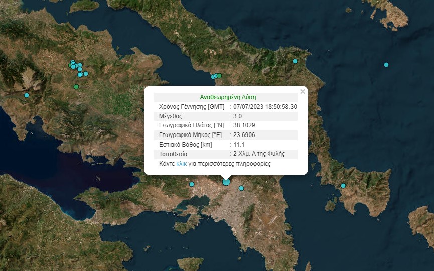 Σεισμός μεγέθους 3 Ρίχτερ καταγράφηκε το βράδυ της Παρασκευής στην Αττική. Σύμφωνα με το Εθνικό Αστεροσκοπείο Αθηνών η δόνηση σημειώθηκε στις 21:50 και είχε επίκεντρο 2 χιλιόμετρα βορειοανατολικά της Φυλής. Το εστιακό βάθος του σεισμού ήταν 2,3 χιλιόμετρα.