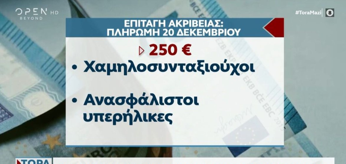 Ενόψει και των χριστουγεννιάτικων εορτών η επιταγή ακριβείας ύψους 250 ευρώ φαίνεται ότι θα πληρωθεί στους δικαιούχους μέχρι τις 20 Δεκεμβρίου, επιφυλάσσοντας όμως παγίδες που θα αποκλείσουν πολλούς πολίτες. Ειδικότερα, το έκτακτο αυτό επίδομα, θα λάβουν οι χαμηλοσυνταξιούχοι, οι ανασφάλιστοι υπερήλικες, οι δικαιούχοι επιδομάτων αναπηρίας και οι μακροχρόνια άνεργοι. Όσον αφορά τις εισοδηματικές προϋποθέσεις που πρέπει […]