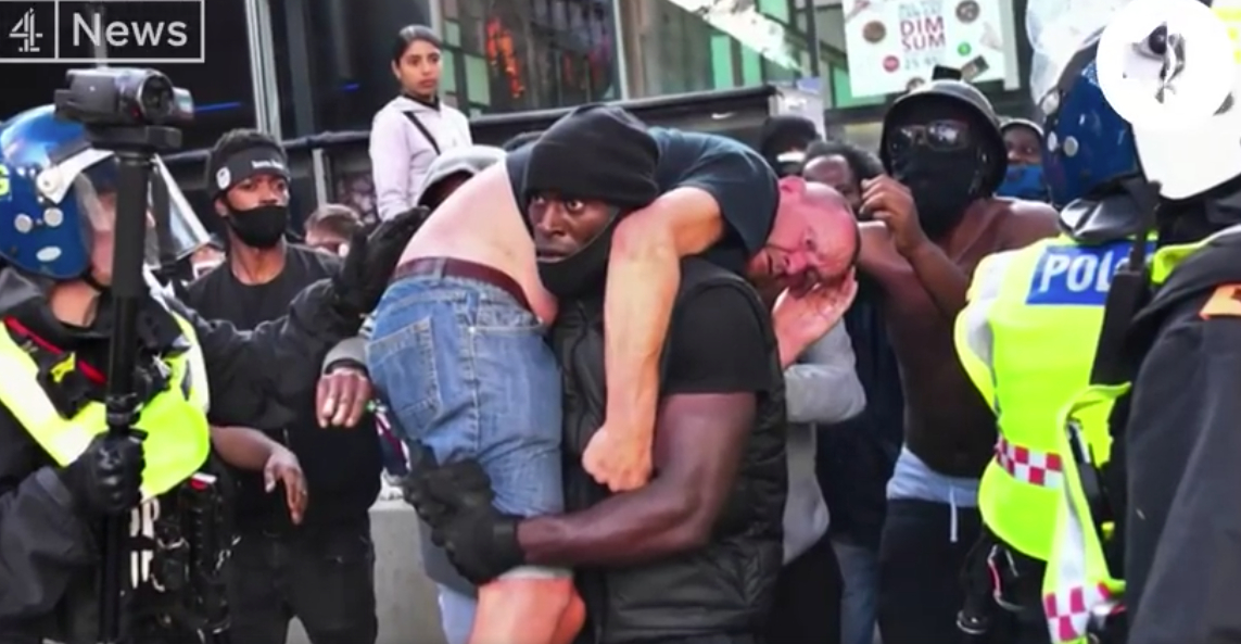 Μαύρος διαδηλωτής μεταφέρει τραυματία λευκό εν μέσω συγκρούσεων στο Λονδίνο