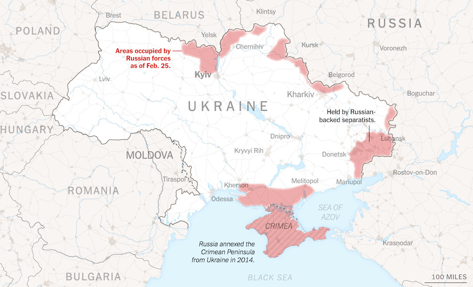 Χάρτη με τις περιοχές που έχει καταλάβει ήδη ο ρωσικός στρατός και με τα σημεία που μαίνονται οι μάχες δημοσιεύουν οι New York Times. Οι ρωσικές δυνάμεις ελέγχουν το Ντονμπάς και φένεται να έχουν προωθηθεί βορείως των περιοχών του Κιέβου, του Τσερνίχιβ και του Χάρκοβου. Ρωσικές δυνάμεις έχουν πλέον εισέλθει στα δυτικά προάστια της ουκρανικής […]