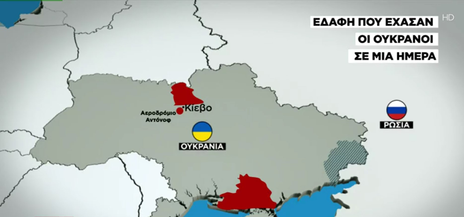 Σύμφωναμε ρεπορτάζ του ΣΚΑΪ, η Ουκρανική κυβέρνηση παραδέχεται ότι έχει χάσει τρεις περιοχές Τσέρνομπιλ, Αεροδρόμιο Αντόνοφ και Χερσώνα, μέσα σε 15 ώρες μετά την εισβολή της Ρωσίας τα ξημερώματα της Πέμπτης.