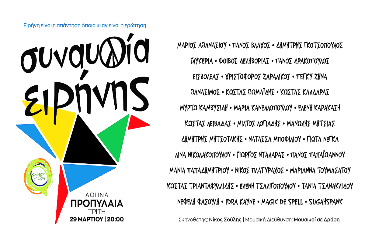 Σήμερα θα πραγματοποιηθεί η μεγάλη συναυλία Ειρήνης στα Προπύλαια στις 20:00, με αίτημα να σταματήσει ο πόλεμος στην Ουκρανία και την αλληλεγγύη στους πρόσφυγες. Διοργανωτής είναι η «Αλληλεγγύη για Όλους». Αναλυτικά, η ανακοίνωση των διοργανωτών: «Καταδικάζουμε την ρωσική εισβολή στην Ουκρανία. Απαιτούμε να σταματήσει τώρα ο πόλεμος Γνωρίζουμε ότι όταν κερδίζει ο πόλεμος, χάνει η […]