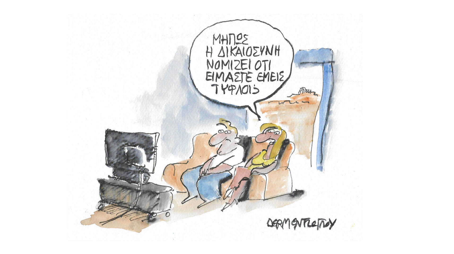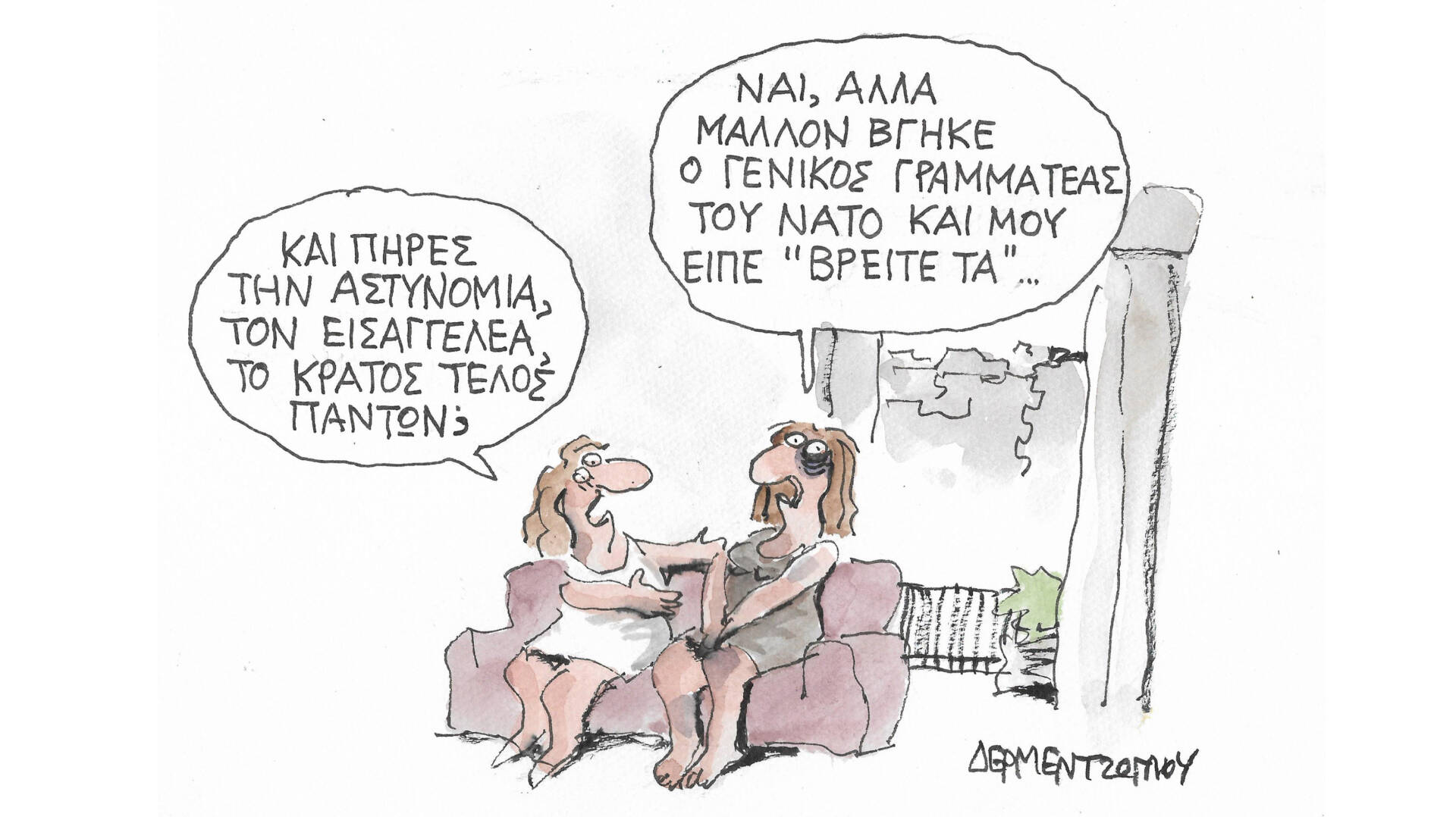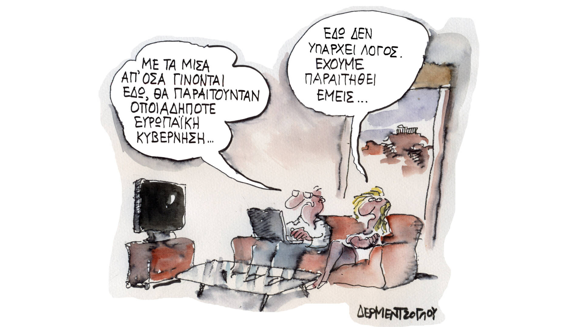 Σκίτσο από το άλμπουμ του Γιάννη Δερμεντζόγλου «Ερωτήσεις Κρίσεων».