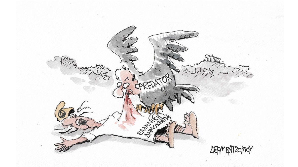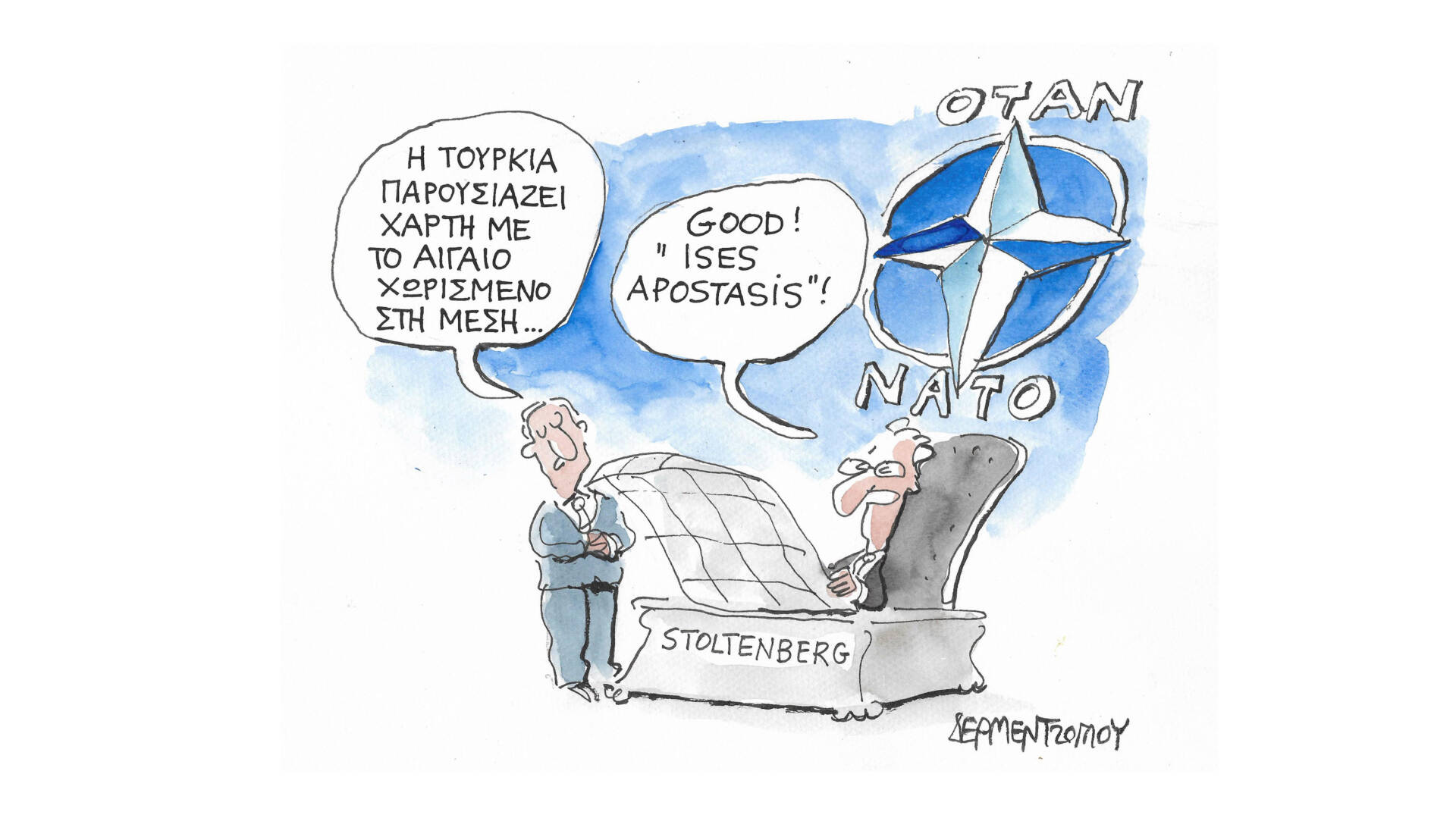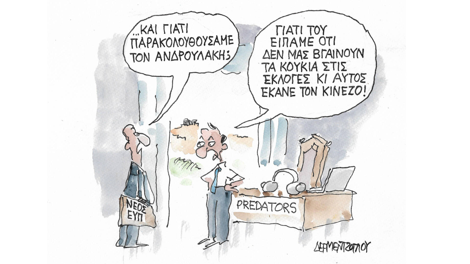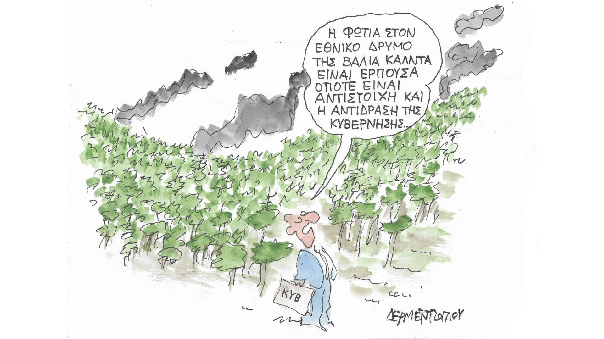 Σκίτσο από το άλμπουμ του Γιάννη Δερμεντζόγλου «Ερωτήσεις Κρίσεων».